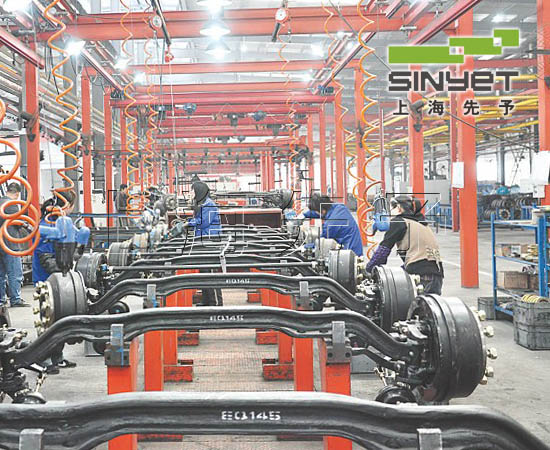 工藝車橋生產(chǎn)線系統(tǒng)構(gòu)成: 生產(chǎn)線線體:板鏈或地拖鏈形式、臺車地下返回,由驅(qū)動裝置、張緊裝置、機架、鏈條、臺板等組成。 裝配臺車或支撐:根據(jù)要求設(shè)計,支撐間距可調(diào),可前橋、后橋單獨也可混流生產(chǎn)。 鋼結(jié)構(gòu):空中吊掛或地面立柱。 上線設(shè)備:天車或KBK輕便吊。 懸掛式軸承壓裝機:用于車橋兩端軸承的在線壓裝。 后橋翻轉(zhuǎn)機:方便安裝,用于裝配中的在線翻轉(zhuǎn)。 附帶工事:光帶照明、風(fēng)扇、工具滑軌、壓縮空氣管路等。 控制系統(tǒng):采用PLC控制。 生產(chǎn)總裝線:摩擦輥輪式線體、各類選墊機、壓裝機、擰緊機等。 其它:分裝線、驅(qū)動橋試驗機、差速器裝配線、擰緊機等設(shè)備。